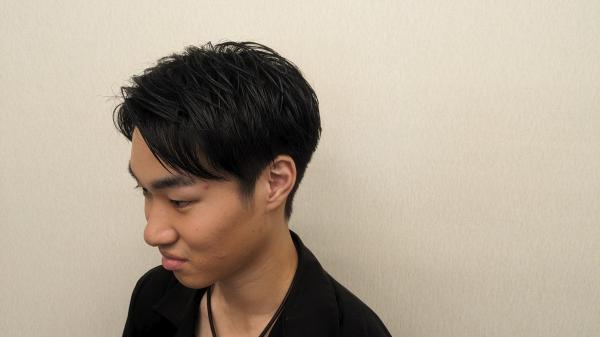 周りは0mm〜6mmですっきりと刈り上げ、トップにはピンパーマ(毛先パーマ)を施したスタイルになります。直毛・朝時間がない方にはオススメのパーマです。