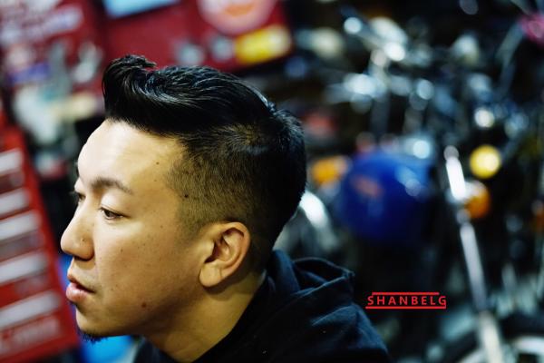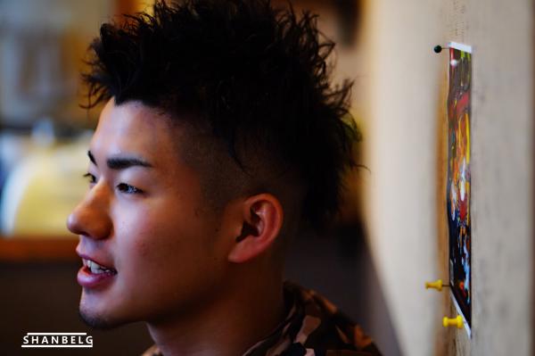 フェードカットとバックにかけたパーマが特徴なスタイル、しっかり分け目をつけていないのでどこからでも分けれます